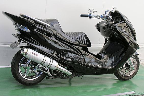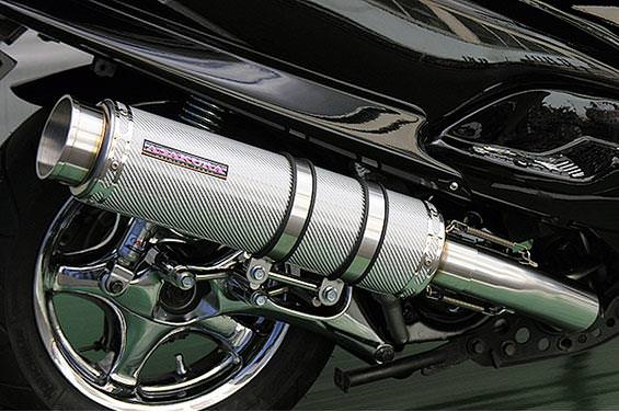 ■受注生産商品となっており、商品手配後 2週間程度入荷にお時間を頂きます。■大柄なビッグスクーターの車体にマッチするよう、極太のエキパイ60mm径、サイレンサー110mm径という仕様で、バランスのとれた仕上がりなっています。ホワイトカーボンタイプはステンレスサイレンサーにカーボンシートを巻いた仕様で、耐久性が抜群に高い構造を採用しています。排気口はステンレス削りだし部材を採用し無骨で迫力のある「BSタイプ」です。サイレンサーバンドにはスリットタイプを採用してデザインにもこだわっています。サイレンサーの固定にはサイレンサーバンドを採用し、バフ仕上げを施したステンレス製丸棒で組んだステーを介して固定しておりますので、従来のステーの固定より車体と調和した高級感あふれるマフラーです。オールステンレス製で、エキパイからサイレンサーまでバフ仕上げを施しています。低中速を落とすことなく高回転でスムーズに回り扱いやすい設定になっています。振動防止のためサイレンサーとエキパイが2分割となる安心設計になっています。サイレンサーは、3点止めになっていますのでしっかりと固定でき、耐久性にも優れています。無加工ボルトオンにて装着できますので、必要な工具があれば簡単に取り付けできます。(取り付けに必要なボルト類は全て付属しております。)サイレンサーはストレート構造ではなくフロント部にパンチングを施した作りになっていますので、音量は静かめに抑えられており近所迷惑になる事無く安心して走行できます。ローダウンにも対応しておりますので、安心してご使用下さい。バッフル装着時 約86db(法定規制値内音量)バッフル非装着時 約89dbになります。