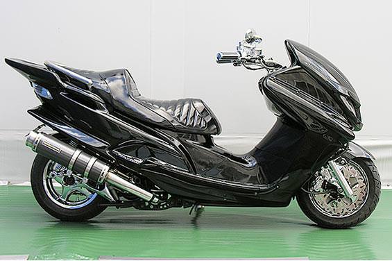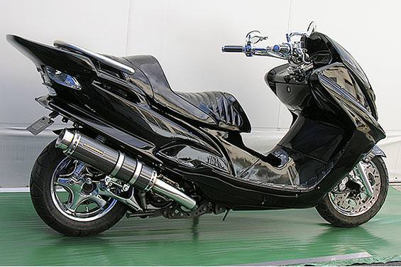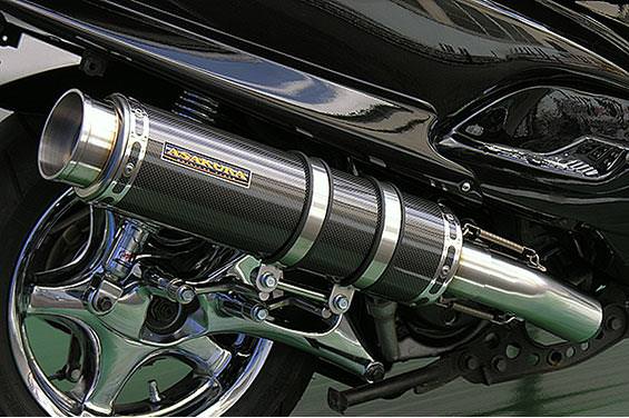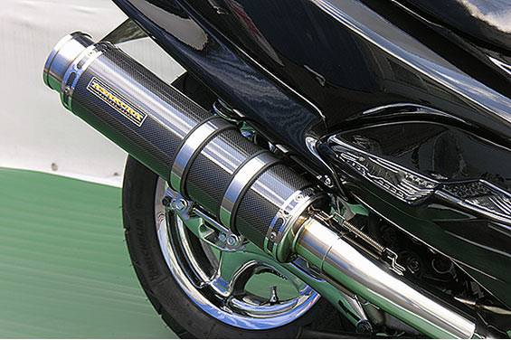 ■受注生産商品となっており、商品手配後 2週間程度入荷にお時間を頂きます。■大柄なビッグスクーターの車体にマッチするよう、極太のエキパイ60mm径、サイレンサー110mm径という仕様で、バランスのとれた仕上がりなっています。ブラックカーボンタイプはステンレスサイレンサーにカーボンシートを巻いた仕様で、耐久性が抜群に高い構造を採用しています。排気口はステンレス削りだし部材を採用し無骨で迫力のある「BSタイプ」です。サイレンサーバンドにはスリットタイプを採用してデザインにもこだわっています。サイレンサーの固定にはサイレンサーバンドを採用し、バフ仕上げを施したステンレス製丸棒で組んだステーを介して固定しておりますので、従来のステーの固定より車体と調和した高級感あふれるマフラーです。オールステンレス製で、エキパイからサイレンサーまでバフ仕上げを施しています。低中速を落とすことなく高回転でスムーズに回り扱いやすい設定になっています。振動防止のためサイレンサーとエキパイが2分割となる安心設計になっています。サイレンサーは、3点止めになっていますのでしっかりと固定でき、耐久性にも優れています。無加工ボルトオンにて装着できますので、必要な工具があれば簡単に取り付けできます。(取り付けに必要なボルト類は全て付属しております。)サイレンサーはストレート構造ではなくフロント部にパンチングを施した作りになっていますので、音量は静かめに抑えられており近所迷惑になる事無く安心して走行できます。ローダウンにも対応しておりますので、安心してご使用下さい。バッフル装着時 約86db(法定規制値内音量)バッフル非装着時 約89dbになります。