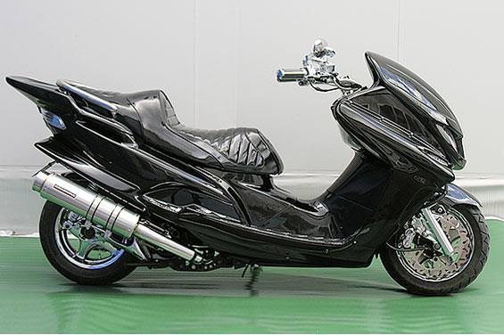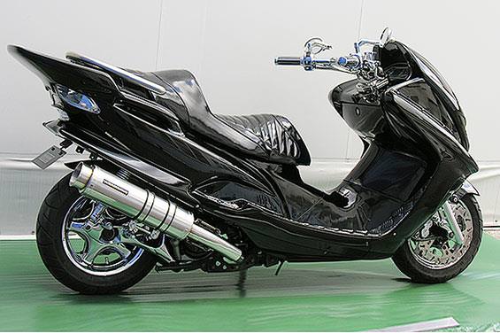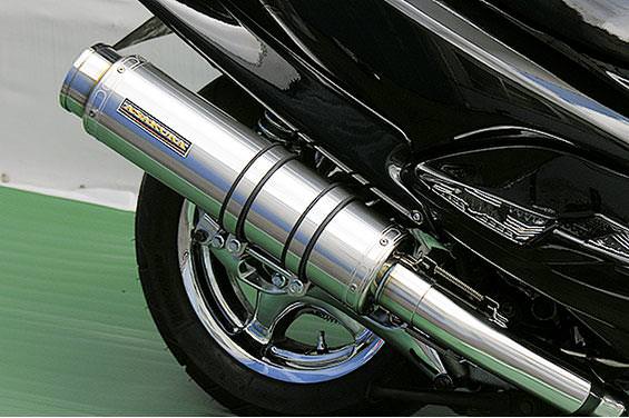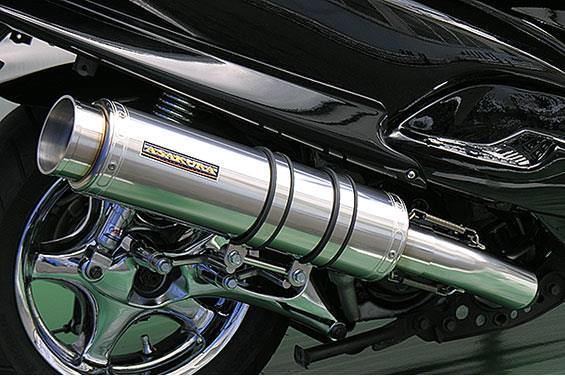 ■受注生産商品となっており、商品手配後 2週間程度入荷にお時間を頂きます。■大柄なビッグスクーターの車体にマッチするよう、極太のエキパイ60mm径、サイレンサー110mm径という仕様で、バランスのとれた仕上がりなっています。メタルタイプはステンレスをバフ磨きでピカピカに仕上げています。排気口はステンレス削りだし部材を採用し無骨で迫力のある「BSタイプ」です。サイレンサーバンドにはスリットタイプを採用してデザインにもこだわっています。サイレンサーの固定にはサイレンサーバンドを採用し、バフ仕上げを施したステンレス製丸棒で組んだステーを介して固定しておりますので、従来のステーの固定より車体と調和した高級感あふれるマフラーです。オールステンレス製で、エキパイからサイレンサーまでバフ仕上げを施しています。低中速を落とすことなく高回転でスムーズに回り扱いやすい設定になっています。振動防止のためサイレンサーとエキパイが2分割となる安心設計になっています。サイレンサーは、3点止めになっていますのでしっかりと固定でき、耐久性にも優れています。無加工ボルトオンにて装着できますので、必要な工具があれば簡単に取り付けできます。(取り付けに必要なボルト類は全て付属しております。)サイレンサーはストレート構造ではなくフロント部にパンチングを施した作りになっていますので、音量は静かめに抑えられており近所迷惑になる事無く安心して走行できます。ローダウンにも対応しておりますので、安心してご使用下さい。バッフル装着時 約86db(法定規制値内音量)バッフル非装着時 約89dbになります。