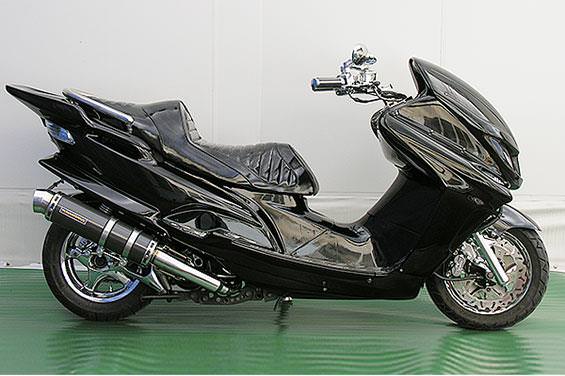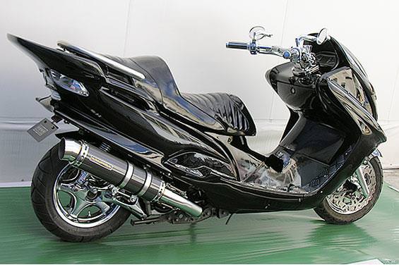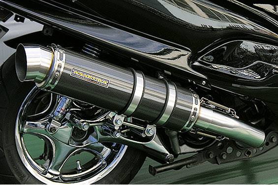 ■受注生産商品となっており、商品手配後 2週間程度入荷にお時間を頂きます。■大柄なビッグスクーターの車体にマッチするよう、極太のエキパイ60mm径、サイレンサー110mm径という仕様で、バランスのとれた仕上がりなっています。ブラックカーボンタイプはステンレスサイレンサーにカーボンシートを巻いた仕様で、耐久性が抜群に高い構造を採用しています。排気口はステンレス削りだし部材を採用し無骨で迫力のある「BSタイプ」です。サイレンサーバンドにはスリットタイプを採用してデザインにもこだわっています。サイレンサーの固定にはサイレンサーバンドを採用し、バフ仕上げを施したステンレス製丸棒で組んだステーを介して固定しておりますので、従来のステーの固定より車体と調和した高級感あふれるマフラーです。オールステンレス製で、エキパイからサイレンサーまでバフ仕上げを施しています。低中速を落とすことなく高回転でスムーズに回り扱いやすい設定になっています。振動防止のためサイレンサーとエキパイが2分割となる安心設計になっています。サイレンサーは、3点止めになっていますのでしっかりと固定でき、耐久性にも優れています。無加工ボルトオンにて装着できますので、必要な工具があれば簡単に取り付けできます。(取り付けに必要なボルト類は全て付属しております。)サイレンサーはストレート構造ではなくフロント部にパンチングを施した作りになっていますので、音量は静かめに抑えられており近所迷惑になる事無く安心して走行できます。ローダウンにも対応しておりますので、安心してご使用下さい。バッフル装着時 約86db(法定規制値内音量)バッフル非装着時 約89dbになります。