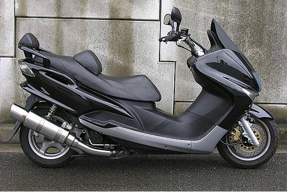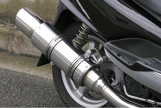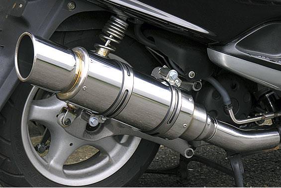 ■受注生産商品となっており、商品手配後 2週間程度入荷にお時間を頂きます。■サイレンサーは新設計構造を採用し軽量化を図っています。出口はインナーカールエンドタイプで、厚みのある上品な仕上がりになっています。サイレンサーバンドにはスリットタイプを採用してデザインにもこだわっており、従来のステーの固定からサイレンサーバンドで固定することにより、車体と調和したニュースタイルのマフラーを完成させました。オールステンレス製で、エキパイからサイレンサーまでバフ仕上げを施しています。ビッグスクーターにマッチするようエキパイ径60mm、サイレンサー径125mmの仕様で、装着時の全体的なバランスがとれた仕上がりとなっています。低中速を落とすことなく高回転でスムーズに回り扱いやすい設定になっています。振動防止のためサイレンサーとエキパイが2分割となる安心設計になっています。サイレンサーは、2点止めになっていますのでしっかりと固定でき、耐久性にも優れています。無加工ボルトオンにて装着できますので、必要な工具があれば簡単に取り付けできます。(取り付けに必要なボルト類は全て付属しております。)サイレンサーはストレート構造ではなくフロント部にパンチングを施した作りになっていますので、音量は静かめに抑えられており近所迷惑になる事無く安心して走行できます。ローダウンにも対応しておりますので、安心してご使用下さい。バッフル装着時 約88db(法定規制値内音量)バッフル非装着時 約92dbになります。