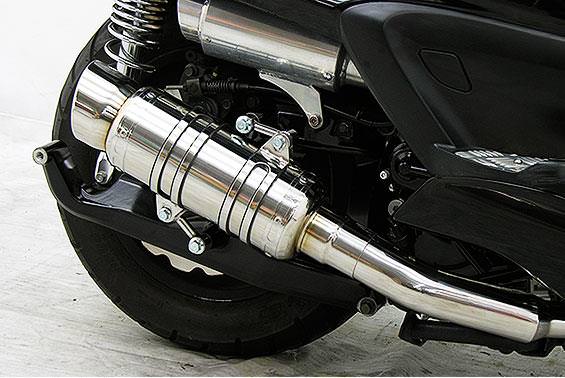 ■受注生産商品となっており、商品手配後 2週間程度入荷にお時間を頂きます。■浅倉商事が自信を持ってお届けする、極限まで価格を抑えた次世代の新定番マフラーです。オールステンレス製でエキパイからサイレンサーまでバフ仕上げを施しています。ビッグスクーターにマッチするよう極太のエキパイ60mm径、サイレンサー110mm径の仕様で、非常にバランスのとれた仕上がりなっています。性能面は、低中速を落とすことなく高回転でスムーズに回り扱いやすい設定になっています。サイレンサーは、ストレート構造ではなくフロント部にパンチングを施した作りになっていますので音量は、静かめに押さえられ近所迷惑になる事無く安心して走行できます。音質も耳障りな音でなくバッフル装着時は静かめの低音、バッフル非装着時は心地よい最高の重低音を実現しております。無加工ボルトオンにて装着できますので、必要な工具があれば簡単に取り付けできます。(取り付けに必要なボルト類は全て付属しております。)振動防止のためサイレンサーとエキパイが2分割になる安心設計になっており、耐久性が抜群に高い構造を採用しています。サイレンサーの固定にはサイレンサーバンドを採用し、バフ仕上げを施したステンレス製丸棒で組んだステーを介して固定しておりますので、従来のステーの固定より車体と調和した高級感あふれるマフラーです。ローダウンにも対応しておりますので、安心してご使用下さい。排気音量はバッフル装着時 約90db(法定規制値内音量)バッフル非装着時 約93db になります。