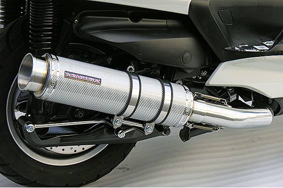 ■受注生産商品となっており、商品手配後 2週間程度入荷にお時間を頂きます。■大柄なビッグスクーターの車体にマッチするよう、極太のエキパイ60mm径、サイレンサー110mm径という仕様で、バランスのとれた仕上がりなっています。ホワイトカーボンタイプはステンレスサイレンサーにカーボンシートを巻いた仕様で、耐久性が抜群に高い構造を採用しています。排気口はステンレス削りだし部材を採用し無骨で迫力のある「BSタイプ」です。サイレンサーバンドにはスリットタイプを採用してデザインにもこだわっています。サイレンサーの固定にはサイレンサーバンドを採用し、バフ仕上げを施したステンレス製丸棒で組んだステーを介して固定しておりますので、従来のステーの固定より車体と調和した高級感あふれるマフラーです。オールステンレス製で、エキパイからサイレンサーまでバフ仕上げを施しています。低中速を落とすことなく高回転でスムーズに回り扱いやすい設定になっています。振動防止のためサイレンサーとエキパイが2分割となる安心設計になっています。サイレンサーは、3点止めになっていますのでしっかりと固定でき、耐久性にも優れています。無加工ボルトオンにて装着できますので、必要な工具があれば簡単に取り付けできます。(取り付けに必要なボルト類は全て付属しております。)サイレンサーはストレート構造ではなくフロント部にパンチングを施した作りになっていますので、音量は静かめに抑えられており近所迷惑になる事無く安心して走行できます。ローダウンにも対応しておりますので、安心してご使用下さい。バッフル装着時 約89db(法定規制値内音量)バッフル非装着時 約92dbになります。