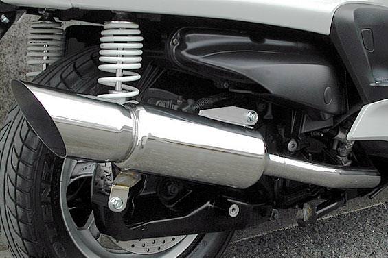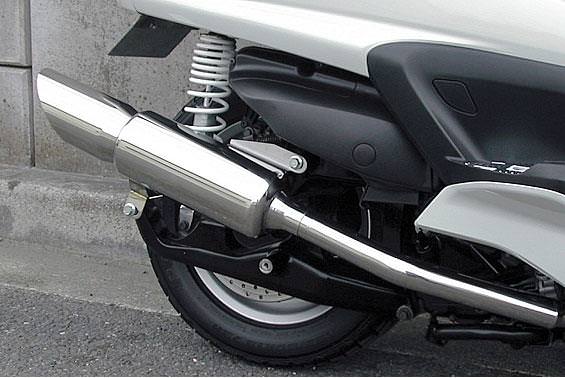■受注生産商品となっており、商品手配後 2週間程度入荷にお時間を頂きます。■オールステンレス製で、エキパイからサイレンサーまでバフ仕上げを施しています。ビッグスクーターにマッチするようエキパイ径45mm、サイレンサー径115mmの仕様で、装着時の全体的なバランスがとれた仕上がりとなっています。低中速を落とすことなく高回転でスムーズに回り扱いやすい設定になっています。振動防止のためサイレンサーとエキパイが2分割となる安心設計になっています。サイレンサーは、2点止めになっていますのでしっかりと固定でき、耐久性にも優れています。無加工ボルトオンにて装着できますので、必要な工具があれば簡単に取り付けできます。(取り付けに必要なボルト類は全て付属しております。)サイレンサーはストレート構造ではなくフロント部にパンチングを施した作りになっていますので、音量は静かめに抑えられており近所迷惑になる事無く安心して走行できます。ローダウンにも対応しておりますので、安心してご使用下さい。バッフル装着時 約92db(法定規制値内音量)バッフル非装着時 約96dbになります。