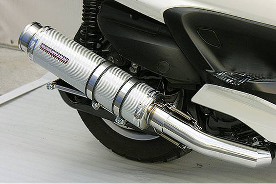 ■受注生産商品となっており、商品手配後 2週間程度入荷にお時間を頂きます。■※2008年式以降のエキパイにO2センサーが装備されているモデルに適合します。O2センサーがエキパイに装着できるようになっております。大柄なビッグスクーターの車体にマッチするよう、極太のエキパイ60mm径、サイレンサー110mm径という仕様で、バランスのとれた仕上がりなっています。ホワイトカーボンタイプはステンレスサイレンサーにカーボンシートを巻いた仕様で、耐久性が抜群に高い構造を採用しています。排気口はステンレス削りだし部材を採用し無骨で迫力のある「BSタイプ」です。サイレンサーバンドにはスリットタイプを採用してデザインにもこだわっています。サイレンサーの固定にはサイレンサーバンドを採用し、バフ仕上げを施したステンレス製丸棒で組んだステーを介して固定しておりますので、従来のステーの固定より車体と調和した高級感あふれるマフラーです。オールステンレス製で、エキパイからサイレンサーまでバフ仕上げを施しています。低中速を落とすことなく高回転でスムーズに回り扱いやすい設定になっています。振動防止のためサイレンサーとエキパイが2分割となる安心設計になっています。サイレンサーは、3点止めになっていますのでしっかりと固定でき、耐久性にも優れています。無加工ボルトオンにて装着できますので、必要な工具があれば簡単に取り付けできます。(取り付けに必要なボルト類は全て付属しております。)サイレンサーはストレート構造ではなくフロント部にパンチングを施した作りになっていますので、音量は静かめに抑えられており近所迷惑になる事無く安心して走行できます。ローダウンにも対応しておりますので、安心してご使用下さい。