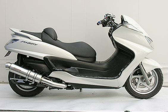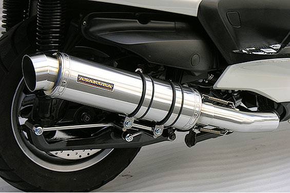 ■受注生産商品となっており、商品手配後 2週間程度入荷にお時間を頂きます。■※2008年式以降のエキパイにO2センサーが装備されているモデルに適合します。O2センサーがエキパイに装着できるようになっております。大柄なビッグスクーターの車体にマッチするよう、極太のエキパイ60mm径、サイレンサー110mm径という仕様で、バランスのとれた仕上がりなっています。メタルタイプはステンレスをバフ磨きでピカピカに仕上げています。排気口はステンレス削りだし部材を採用し無骨で迫力のある「BSタイプ」です。サイレンサーバンドにはスリットタイプを採用してデザインにもこだわっています。サイレンサーの固定にはサイレンサーバンドを採用し、バフ仕上げを施したステンレス製丸棒で組んだステーを介して固定しておりますので、従来のステーの固定より車体と調和した高級感あふれるマフラーです。オールステンレス製で、エキパイからサイレンサーまでバフ仕上げを施しています。低中速を落とすことなく高回転でスムーズに回り扱いやすい設定になっています。振動防止のためサイレンサーとエキパイが2分割となる安心設計になっています。サイレンサーは、3点止めになっていますのでしっかりと固定でき、耐久性にも優れています。無加工ボルトオンにて装着できますので、必要な工具があれば簡単に取り付けできます。(取り付けに必要なボルト類は全て付属しております。)サイレンサーはストレート構造ではなくフロント部にパンチングを施した作りになっていますので、音量は静かめに抑えられており近所迷惑になる事無く安心して走行できます。ローダウンにも対応しておりますので、安心してご使用下さい。