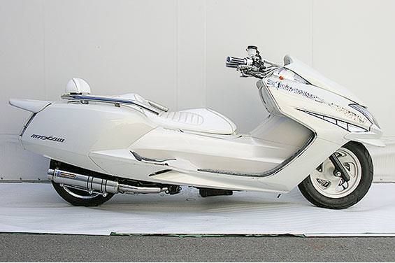 ■受注生産商品となっており、商品手配後 2週間程度入荷にお時間を頂きます。■大柄なビッグスクーターの車体にマッチするよう、極太のエキパイ60mm径、サイレンサー110mm径という仕様で、バランスのとれた仕上がりなっています。メタルタイプはステンレスをバフ磨きでピカピカに仕上げています。排気口はステンレス削りだし部材を採用し無骨で迫力のある「BSタイプ」です。サイレンサーバンドにはスリットタイプを採用してデザインにもこだわっています。サイレンサーの固定にはサイレンサーバンドを採用し、バフ仕上げを施したステンレス製丸棒で組んだステーを介して固定しておりますので、従来のステーの固定より車体と調和した高級感あふれるマフラーです。オールステンレス製で、エキパイからサイレンサーまでバフ仕上げを施しています。低中速を落とすことなく高回転でスムーズに回り扱いやすい設定になっています。振動防止のためサイレンサーとエキパイが2分割となる安心設計になっています。サイレンサーは、3点止めになっていますのでしっかりと固定でき、耐久性にも優れています。無加工ボルトオンにて装着できますので、必要な工具があれば簡単に取り付けできます。(取り付けに必要なボルト類は全て付属しております。)サイレンサーはストレート構造ではなくフロント部にパンチングを施した作りになっていますので、音量は静かめに抑えられており近所迷惑になる事無く安心して走行できます。ローダウンにも対応しておりますので、安心してご使用下さい。バッフル装着時 約89db(法定規制値内音量)バッフル非装着時 約92dbになります。