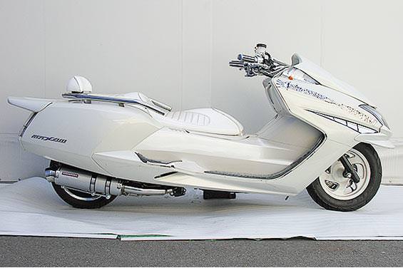 ■受注生産商品となっており、商品手配後 2週間程度入荷にお時間を頂きます。■大柄なビッグスクーターの車体にマッチするよう、極太のエキパイ60mm径、サイレンサー110mm径という仕様で、バランスのとれた仕上がりなっています。ホワイトカーボンタイプはステンレスサイレンサーにカーボンシートを巻いた仕様で、耐久性が抜群に高い構造を採用しています。排気口はステンレス削りだし部材を採用し無骨で迫力のある「BSタイプ」です。サイレンサーバンドにはスリットタイプを採用してデザインにもこだわっています。サイレンサーの固定にはサイレンサーバンドを採用し、バフ仕上げを施したステンレス製丸棒で組んだステーを介して固定しておりますので、従来のステーの固定より車体と調和した高級感あふれるマフラーです。オールステンレス製で、エキパイからサイレンサーまでバフ仕上げを施しています。低中速を落とすことなく高回転でスムーズに回り扱いやすい設定になっています。振動防止のためサイレンサーとエキパイが2分割となる安心設計になっています。サイレンサーは、3点止めになっていますのでしっかりと固定でき、耐久性にも優れています。無加工ボルトオンにて装着できますので、必要な工具があれば簡単に取り付けできます。(取り付けに必要なボルト類は全て付属しております。)サイレンサーはストレート構造ではなくフロント部にパンチングを施した作りになっていますので、音量は静かめに抑えられており近所迷惑になる事無く安心して走行できます。ローダウンにも対応しておりますので、安心してご使用下さい。バッフル装着時 約89db(法定規制値内音量)バッフル非装着時 約92dbになります。