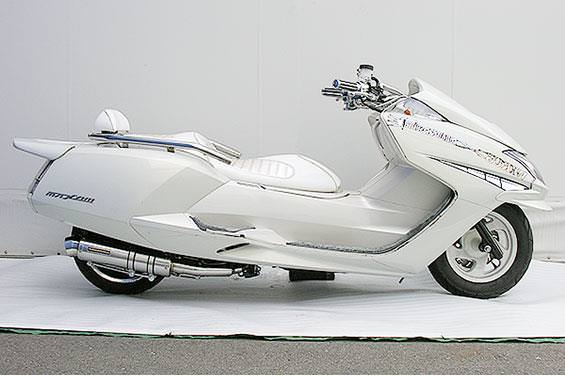 ■受注生産商品となっており、商品手配後 2週間程度入荷にお時間を頂きます。■大柄なビッグスクーターの車体にマッチするよう、極太のエキパイ60mm径、サイレンサー110mm径という仕様で、バランスのとれた仕上がりなっています。メタルタイプはステンレスをバフ磨きでピカピカに仕上げています。排気口はステンレス削りだし部材を採用し無骨で迫力のある「BSタイプ」です。サイレンサーバンドにはスリットタイプを採用してデザインにもこだわっています。サイレンサーの固定にはサイレンサーバンドを採用し、バフ仕上げを施したステンレス製丸棒で組んだステーを介して固定しておりますので、従来のステーの固定より車体と調和した高級感あふれるマフラーです。オールステンレス製で、エキパイからサイレンサーまでバフ仕上げを施しています。低中速を落とすことなく高回転でスムーズに回り扱いやすい設定になっています。振動防止のためサイレンサーとエキパイが2分割となる安心設計になっています。サイレンサーは、3点止めになっていますのでしっかりと固定でき、耐久性にも優れています。無加工ボルトオンにて装着できますので、必要な工具があれば簡単に取り付けできます。(取り付けに必要なボルト類は全て付属しております。)サイレンサーはストレート構造ではなくフロント部にパンチングを施した作りになっていますので、音量は静かめに抑えられており近所迷惑になる事無く安心して走行できます。ローダウンにも対応しておりますので、安心してご使用下さい。バッフル装着時 約89db(法定規制値内音量)バッフル非装着時 約92dbになります。