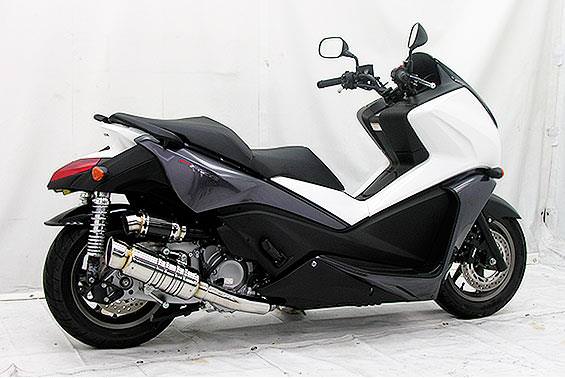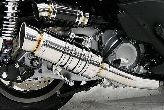 ■受注生産商品となっており、商品手配後 2週間程度入荷にお時間を頂きます。■※平成22年4月1日より施行された認証制度に適合する認証マフラーではありません。ご理解の程よろしくお願い致します。オールステンレス製でエキパイからサイレンサーまでバフ仕上げを施しています。ビッグスクーターにマッチするよう極太のエキパイ60mm径、サイレンサー110mm径の仕様で、非常にバランスのとれた仕上がりなっています。性能面は、低中速を落とすことなく高回転でスムーズに回り扱いやすい設定になっています。サイレンサーは、ストレート構造ではなくフロント部にパンチングを施した作りになっていますので音量は、静かめに押さえられ近所迷惑になる事無く安心して走行できます。音質も耳障りな音でなくバッフル装着時は静かめの低音、バッフル非装着時は心地よい最高の重低音を実現しております。排気音量はバッフル装着時 約90db(法定規制値内音量)バッフル非装着時 約93db になります。無加工ボルトオンにて装着できますので、必要な工具があれば簡単に取り付けできます。(取り付けに必要なボルト類は全て付属しております。)振動防止のためサイレンサーとエキパイが2分割になる安心設計になっており、耐久性が抜群に高い構造を採用しています。サイレンサーの固定にはサイレンサーバンドを採用し、バフ仕上げを施したステンレス製丸棒で組んだステーを介して固定しておりますので、従来のステーの固定より車体と調和した高級感あふれるマフラーです。ローダウンにも対応しておりますので、安心してご使用下さい。