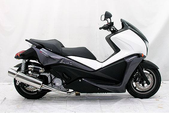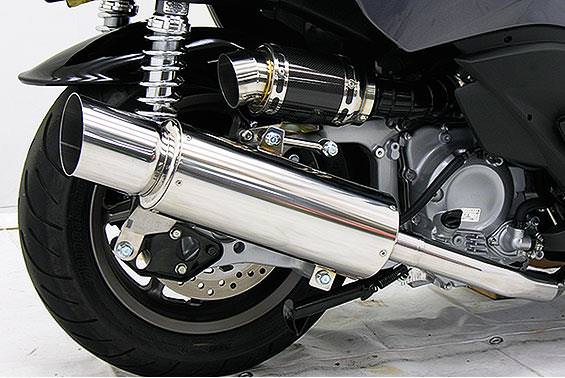 ■受注生産商品となっており、商品手配後 2週間程度入荷にお時間を頂きます。■※平成22年4月1日より施行された認証制度に適合する認証マフラーではありません。ご理解の程よろしくお願い致します。オールステンレス製で、エキパイからサイレンサーまでバフ仕上げを施しています。ビッグスクーターにマッチするようエキパイ径45mm、サイレンサー径120mmの仕様で、装着時の全体的なバランスがとれた仕上がりとなっています。低中速を落とすことなく高回転でスムーズに回り扱いやすい設定になっています。振動防止のためサイレンサーとエキパイが2分割となる安心設計になっています。サイレンサーは、3点止めになっていますのでしっかりと固定でき、耐久性にも優れています。無加工ボルトオンにて装着できますので、必要な工具があれば簡単に取り付けできます。(取り付けに必要なボルト類は全て付属しております。)サイレンサーはストレート構造ではなくフロント部にパンチングを施した作りになっていますので、音量は静かめに抑えられており近所迷惑になる事無く安心して走行できます。バッフル装着時 約87db(法定規制値内音量)バッフル非装着時 約90dbになります。ローダウンにも対応しておりますので、安心してご使用下さい。