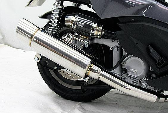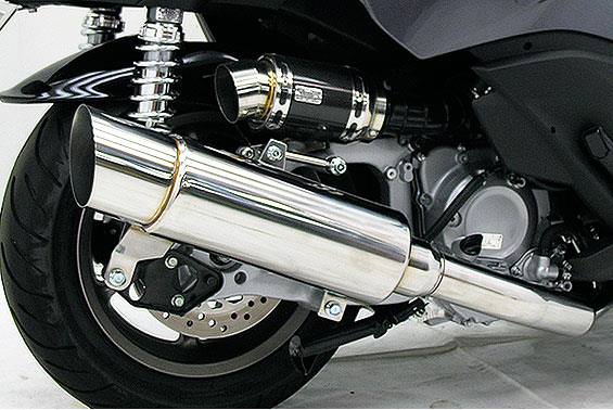 ■受注生産商品となっており、商品手配後 2週間程度入荷にお時間を頂きます。■※平成22年4月1日より施行された認証制度に適合する認証マフラーではありません。ご理解の程よろしくお願い致します。オールステンレス製で、エキパイからサイレンサーまでバフ仕上げを施しています。ビッグスクーターにマッチするようエキパイ径60mm、サイレンサー径125mmの仕様で、装着時の全体的なバランスがとれた仕上がりとなっています。低中速を落とすことなく高回転でスムーズに回り扱いやすい設定になっています。振動防止のためサイレンサーとエキパイが2分割となる安心設計になっています。サイレンサーは、3点止めになっていますのでしっかりと固定でき、耐久性にも優れています。無加工ボルトオンにて装着できますので、必要な工具があれば簡単に取り付けできます。(取り付けに必要なボルト類は全て付属しております。)サイレンサーはストレート構造ではなくフロント部にパンチングを施した作りになっていますので、音量は静かめに抑えられており近所迷惑になる事無く安心して走行できます。バッフル装着時 約92db(法定規制値内音量)バッフル非装着時 約96dbになります。
