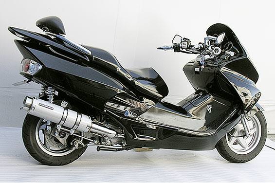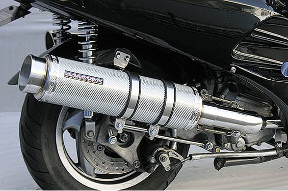 ■受注生産商品となっており、商品手配後 2週間程度入荷にお時間を頂きます。■大柄なビッグスクーターの車体にマッチするよう、極太のエキパイ60mm径、サイレンサー110mm径という仕様で、バランスのとれた仕上がりなっています。ホワイトカーボンタイプはステンレスサイレンサーにカーボンシートを巻いた仕様で、耐久性が抜群に高い構造を採用しています。排気口はステンレス削りだし部材を採用し無骨で迫力のある「BSタイプ」です。サイレンサーバンドにはスリットタイプを採用してデザインにもこだわっています。サイレンサーの固定にはサイレンサーバンドを採用し、バフ仕上げを施したステンレス製丸棒で組んだステーを介して固定しておりますので、従来のステーの固定より車体と調和した高級感あふれるマフラーです。オールステンレス製で、エキパイからサイレンサーまでバフ仕上げを施しています。低中速を落とすことなく高回転でスムーズに回り扱いやすい設定になっています。振動防止のためサイレンサーとエキパイが2分割となる安心設計になっています。サイレンサーは、3点止めになっていますのでしっかりと固定でき、耐久性にも優れています。無加工ボルトオンにて装着できますので、必要な工具があれば簡単に取り付けできます。(取り付けに必要なボルト類は全て付属しております。)サイレンサーはストレート構造ではなくフロント部にパンチングを施した作りになっていますので、音量は静かめに抑えられており近所迷惑になる事無く安心して走行できます。ローダウンにも対応しておりますので、安心してご使用下さい。バッフル装着時 約89db(法定規制値内音量)バッフル非装着時 約92dbになります。