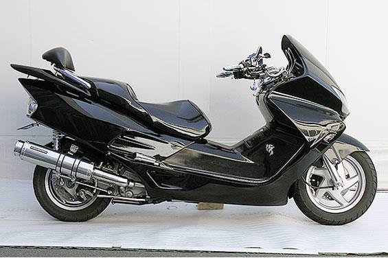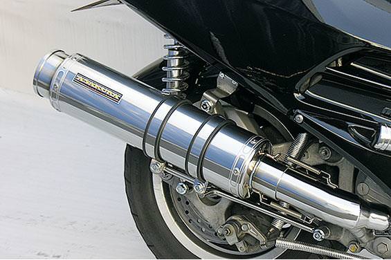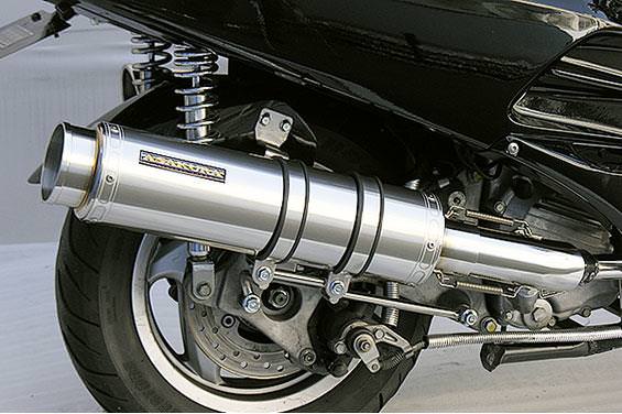 ■受注生産商品となっており、商品手配後 2週間程度入荷にお時間を頂きます。■大柄なビッグスクーターの車体にマッチするよう、極太のエキパイ60mm径、サイレンサー110mm径という仕様で、バランスのとれた仕上がりなっています。メタルタイプはステンレスをバフ磨きでピカピカに仕上げています。排気口はステンレス削りだし部材を採用し無骨で迫力のある「BSタイプ」です。サイレンサーバンドにはスリットタイプを採用してデザインにもこだわっています。サイレンサーの固定にはサイレンサーバンドを採用し、バフ仕上げを施したステンレス製丸棒で組んだステーを介して固定しておりますので、従来のステーの固定より車体と調和した高級感あふれるマフラーです。オールステンレス製で、エキパイからサイレンサーまでバフ仕上げを施しています。低中速を落とすことなく高回転でスムーズに回り扱いやすい設定になっています。振動防止のためサイレンサーとエキパイが2分割となる安心設計になっています。サイレンサーは、3点止めになっていますのでしっかりと固定でき、耐久性にも優れています。無加工ボルトオンにて装着できますので、必要な工具があれば簡単に取り付けできます。(取り付けに必要なボルト類は全て付属しております。)サイレンサーはストレート構造ではなくフロント部にパンチングを施した作りになっていますので、音量は静かめに抑えられており近所迷惑になる事無く安心して走行できます。ローダウンにも対応しておりますので、安心してご使用下さい。バッフル装着時 約89db(法定規制値内音量)バッフル非装着時 約92dbになります。