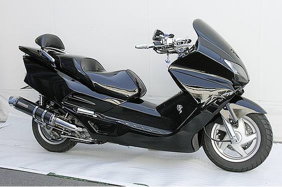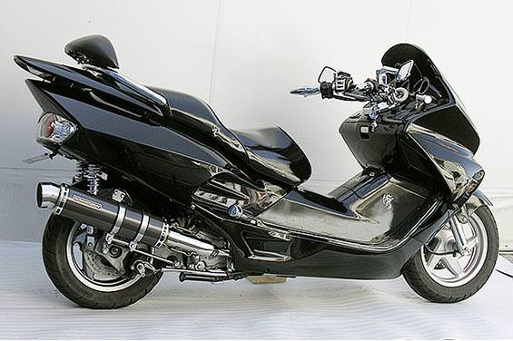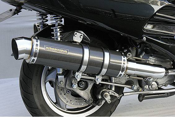 ■受注生産商品となっており、商品手配後 2週間程度入荷にお時間を頂きます。■大柄なビッグスクーターの車体にマッチするよう、極太のエキパイ60mm径、サイレンサー110mm径という仕様で、バランスのとれた仕上がりなっています。ブラックカーボンタイプはステンレスサイレンサーにカーボンシートを巻いた仕様で、耐久性が抜群に高い構造を採用しています。排気口はステンレス削りだし部材を採用し無骨で迫力のある「BSタイプ」です。サイレンサーバンドにはスリットタイプを採用してデザインにもこだわっています。サイレンサーの固定にはサイレンサーバンドを採用し、バフ仕上げを施したステンレス製丸棒で組んだステーを介して固定しておりますので、従来のステーの固定より車体と調和した高級感あふれるマフラーです。オールステンレス製で、エキパイからサイレンサーまでバフ仕上げを施しています。低中速を落とすことなく高回転でスムーズに回り扱いやすい設定になっています。振動防止のためサイレンサーとエキパイが2分割となる安心設計になっています。サイレンサーは、3点止めになっていますのでしっかりと固定でき、耐久性にも優れています。無加工ボルトオンにて装着できますので、必要な工具があれば簡単に取り付けできます。(取り付けに必要なボルト類は全て付属しております。)サイレンサーはストレート構造ではなくフロント部にパンチングを施した作りになっていますので、音量は静かめに抑えられており近所迷惑になる事無く安心して走行できます。ローダウンにも対応しておりますので、安心してご使用下さい。バッフル装着時 約89db(法定規制値内音量)バッフル非装着時 約92dbになります。