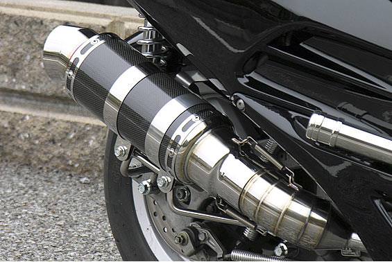 ■受注生産商品となっており、商品手配後 2週間程度入荷にお時間を頂きます。■ダイナミック&圧倒的パフォーマンス!ハイレベルな溶接技術が可能にした、高級感漂う独創的で革新的な究極マフラーです。エキパイ部は76.3mm径の極太パイプの輪切りピースを、絶妙な角度で溶接するワンオフ製法でエキパイを整形しておりますので、迫力のある溶接痕が独特のイメージを演出しております。サイレンサーの固定にはサイレンサーバンドを採用し、バフ仕上げを施したステンレス製丸棒で組んだステーを介して固定しておりますので、従来のステーの固定より車体と調和した高級感あふれるマフラーを完成させました。新設計のサイレンサーは115mm径のステンレスサイレンサーに、カーボンシートを巻いた仕様で、耐久性が抜群に高い構造を採用しています。サイレンサー内部は隔壁構造を採用し、カスタムマフラーにありがちなトルク不足を無くし、ゼロ発進から高速域までスムーズな走行が体感できます。無加工ボルトオンにて装着できますので、必要な工具があれば簡単に取り付けできます。(取り付けに必要なボルト類は全て付属しております。)音量は標準装備のバッフルを装着すれば、規制値内に納まるように静かめの音量に設定していますので、近所迷惑になる事無く安心して走行できます。バッフル装着時 約92db(法定規制値内音量)バッフル非装着時 約96dbになります。