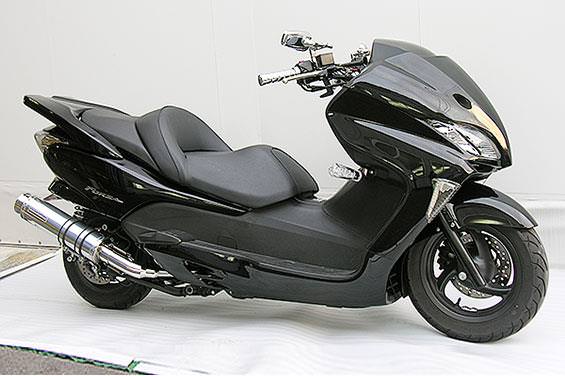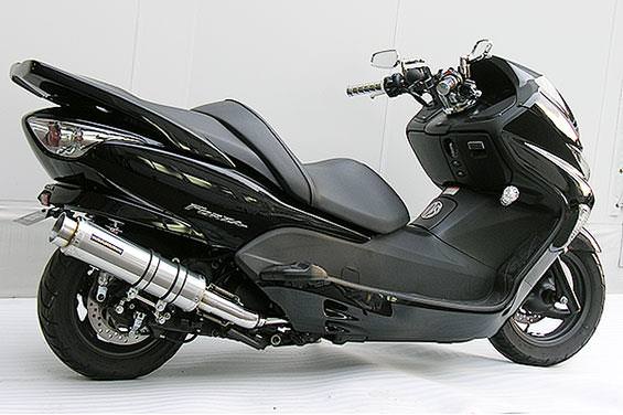 ■受注生産商品となっており、商品手配後 2週間程度入荷にお時間を頂きます。■大柄なビッグスクーターの車体にマッチするよう、極太のエキパイ60mm径、サイレンサー110mm径という仕様で、バランスのとれた仕上がりなっています。メタルタイプはステンレスをバフ磨きでピカピカに仕上げています。排気口はステンレス削りだし部材を採用し無骨で迫力のある「BSタイプ」です。サイレンサーバンドにはスリットタイプを採用してデザインにもこだわっています。サイレンサーの固定にはサイレンサーバンドを採用し、バフ仕上げを施したステンレス製丸棒で組んだステーを介して固定しておりますので、従来のステーの固定より車体と調和した高級感あふれるマフラーです。オールステンレス製で、エキパイからサイレンサーまでバフ仕上げを施しています。低中速を落とすことなく高回転でスムーズに回り扱いやすい設定になっています。振動防止のためサイレンサーとエキパイが2分割となる安心設計になっています。サイレンサーは、3点止めになっていますのでしっかりと固定でき、耐久性にも優れています。無加工ボルトオンにて装着できますので、必要な工具があれば簡単に取り付けできます。(取り付けに必要なボルト類は全て付属しております。)サイレンサーはストレート構造ではなくフロント部にパンチングを施した作りになっていますので、音量は静かめに抑えられており近所迷惑になる事無く安心して走行できます。ローダウンにも対応しておりますので、安心してご使用下さい。バッフル装着時 約89db(法定規制値内音量)バッフル非装着時 約92dbになります。