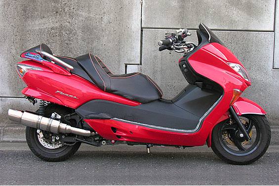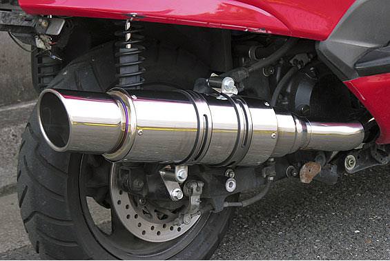 ■受注生産商品となっており、商品手配後 2週間程度入荷にお時間を頂きます。■サイレンサーは新設計構造を採用し軽量化を図っています。出口はインナーカールエンドタイプで、厚みのある上品な仕上がりになっています。サイレンサーバンドにはスリットタイプを採用してデザインにもこだわっており、従来のステーの固定からサイレンサーバンドで固定することにより、車体と調和したニュースタイルのマフラーを完成させました。オールステンレス製で、エキパイからサイレンサーまでバフ仕上げを施しています。ビッグスクーターにマッチするようエキパイ径60mm、サイレンサー径125mmの仕様で、装着時の全体的なバランスがとれた仕上がりとなっています。低中速を落とすことなく高回転でスムーズに回り扱いやすい設定になっています。振動防止のためサイレンサーとエキパイが2分割となる安心設計になっています。サイレンサーは、2点止めになっていますのでしっかりと固定でき、耐久性にも優れています。無加工ボルトオンにて装着できますので、必要な工具があれば簡単に取り付けできます。(取り付けに必要なボルト類は全て付属しております。)サイレンサーはストレート構造ではなくフロント部にパンチングを施した作りになっていますので、音量は静かめに抑えられており近所迷惑になる事無く安心して走行できます。ローダウンにも対応しておりますので、安心してご使用下さい。バッフル装着時 約92db(法定規制値内音量)バッフル非装着時 約96dbになります。