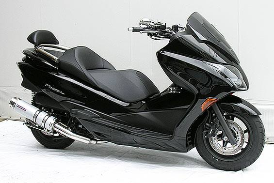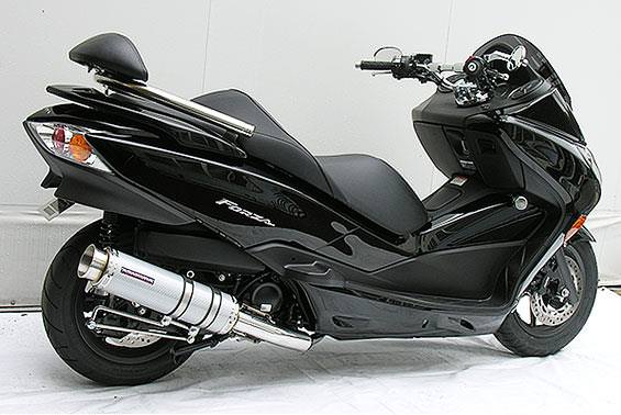 ■受注生産商品となっており、商品手配後 2週間程度入荷にお時間を頂きます。■大柄なビッグスクーターの車体にマッチするよう、極太のエキパイ60mm径、サイレンサー110mm径という仕様で、バランスのとれた仕上がりなっています。ホワイトカーボンタイプはステンレスサイレンサーにカーボンシートを巻いた仕様で、耐久性が抜群に高い構造を採用しています。排気口はステンレス削りだし部材を採用し無骨で迫力のある「BSタイプ」です。サイレンサーバンドにはスリットタイプを採用してデザインにもこだわっています。サイレンサーの固定にはサイレンサーバンドを採用し、バフ仕上げを施したステンレス製丸棒で組んだステーを介して固定しておりますので、従来のステーの固定より車体と調和した高級感あふれるマフラーです。オールステンレス製で、エキパイからサイレンサーまでバフ仕上げを施しています。低中速を落とすことなく高回転でスムーズに回り扱いやすい設定になっています。振動防止のためサイレンサーとエキパイが2分割となる安心設計になっています。サイレンサーは、3点止めになっていますのでしっかりと固定でき、耐久性にも優れています。無加工ボルトオンにて装着できますので、必要な工具があれば簡単に取り付けできます。(取り付けに必要なボルト類は全て付属しております。)サイレンサーはストレート構造ではなくフロント部にパンチングを施した作りになっていますので、音量は静かめに抑えられており近所迷惑になる事無く安心して走行できます。ローダウンにも対応しておりますので、安心してご使用下さい。バッフル装着時 約89db(法定規制値内音量)バッフル非装着時 約92dbになります。