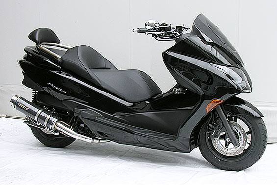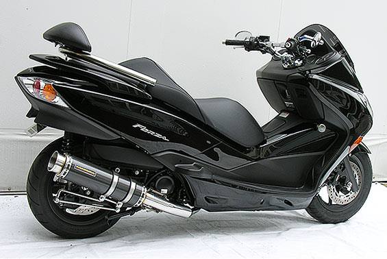 ■受注生産商品となっており、商品手配後 2週間程度入荷にお時間を頂きます。■大柄なビッグスクーターの車体にマッチするよう、極太のエキパイ60mm径、サイレンサー110mm径という仕様で、バランスのとれた仕上がりなっています。ブラックカーボンタイプはステンレスサイレンサーにカーボンシートを巻いた仕様で、耐久性が抜群に高い構造を採用しています。排気口はステンレス削りだし部材を採用し無骨で迫力のある「BSタイプ」です。サイレンサーバンドにはスリットタイプを採用してデザインにもこだわっています。サイレンサーの固定にはサイレンサーバンドを採用し、バフ仕上げを施したステンレス製丸棒で組んだステーを介して固定しておりますので、従来のステーの固定より車体と調和した高級感あふれるマフラーです。オールステンレス製で、エキパイからサイレンサーまでバフ仕上げを施しています。低中速を落とすことなく高回転でスムーズに回り扱いやすい設定になっています。振動防止のためサイレンサーとエキパイが2分割となる安心設計になっています。サイレンサーは、3点止めになっていますのでしっかりと固定でき、耐久性にも優れています。無加工ボルトオンにて装着できますので、必要な工具があれば簡単に取り付けできます。(取り付けに必要なボルト類は全て付属しております。)サイレンサーはストレート構造ではなくフロント部にパンチングを施した作りになっていますので、音量は静かめに抑えられており近所迷惑になる事無く安心して走行できます。ローダウンにも対応しておりますので、安心してご使用下さい。バッフル装着時 約89db(法定規制値内音量)バッフル非装着時 約92dbになります。