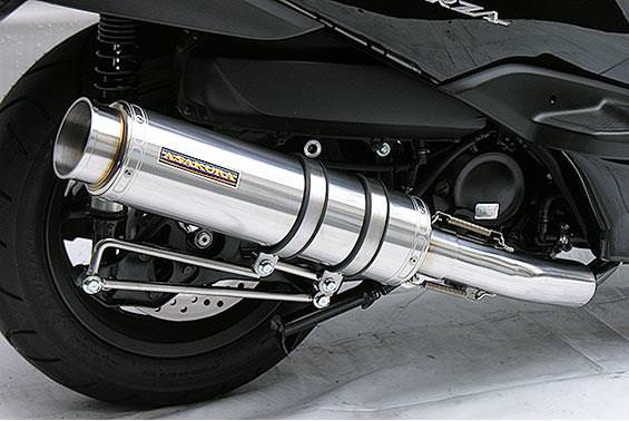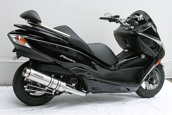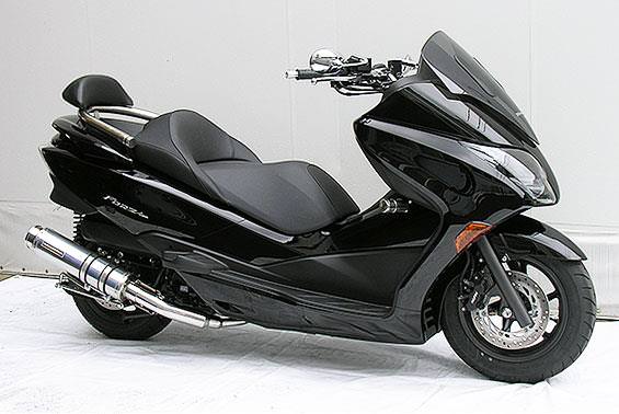 ■受注生産商品となっており、商品手配後 2週間程度入荷にお時間を頂きます。■大柄なビッグスクーターの車体にマッチするよう、極太のエキパイ60mm径、サイレンサー110mm径という仕様で、バランスのとれた仕上がりなっています。メタルタイプはステンレスをバフ磨きでピカピカに仕上げています。排気口はステンレス削りだし部材を採用し無骨で迫力のある「BSタイプ」です。サイレンサーバンドにはスリットタイプを採用してデザインにもこだわっています。サイレンサーの固定にはサイレンサーバンドを採用し、バフ仕上げを施したステンレス製丸棒で組んだステーを介して固定しておりますので、従来のステーの固定より車体と調和した高級感あふれるマフラーです。オールステンレス製で、エキパイからサイレンサーまでバフ仕上げを施しています。低中速を落とすことなく高回転でスムーズに回り扱いやすい設定になっています。振動防止のためサイレンサーとエキパイが2分割となる安心設計になっています。サイレンサーは、3点止めになっていますのでしっかりと固定でき、耐久性にも優れています。無加工ボルトオンにて装着できますので、必要な工具があれば簡単に取り付けできます。(取り付けに必要なボルト類は全て付属しております。)サイレンサーはストレート構造ではなくフロント部にパンチングを施した作りになっていますので、音量は静かめに抑えられており近所迷惑になる事無く安心して走行できます。ローダウンにも対応しておりますので、安心してご使用下さい。バッフル装着時 約89db(法定規制値内音量)バッフル非装着時 約92dbになります。