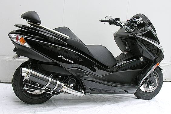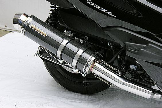 ■受注生産商品となっており、商品手配後 2週間程度入荷にお時間を頂きます。■大柄なビッグスクーターの車体にマッチするよう、極太のエキパイ60mm径、サイレンサー110mm径という仕様で、バランスのとれた仕上がりなっています。ブラックカーボンタイプはステンレスサイレンサーにカーボンシートを巻いた仕様で、耐久性が抜群に高い構造を採用しています。排気口はステンレス削りだし部材を採用し無骨で迫力のある「BSタイプ」です。サイレンサーバンドにはスリットタイプを採用してデザインにもこだわっています。サイレンサーの固定にはサイレンサーバンドを採用し、バフ仕上げを施したステンレス製丸棒で組んだステーを介して固定しておりますので、従来のステーの固定より車体と調和した高級感あふれるマフラーです。オールステンレス製で、エキパイからサイレンサーまでバフ仕上げを施しています。低中速を落とすことなく高回転でスムーズに回り扱いやすい設定になっています。振動防止のためサイレンサーとエキパイが2分割となる安心設計になっています。サイレンサーは、3点止めになっていますのでしっかりと固定でき、耐久性にも優れています。無加工ボルトオンにて装着できますので、必要な工具があれば簡単に取り付けできます。(取り付けに必要なボルト類は全て付属しております。)サイレンサーはストレート構造ではなくフロント部にパンチングを施した作りになっていますので、音量は静かめに抑えられており近所迷惑になる事無く安心して走行できます。ローダウンにも対応しておりますので、安心してご使用下さい。バッフル装着時 約89db(法定規制値内音量)バッフル非装着時 約92dbになります。
