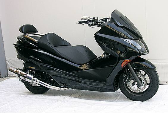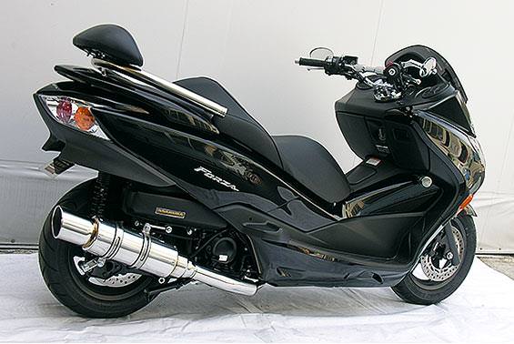 ■受注生産商品となっており、商品手配後 2週間程度入荷にお時間を頂きます。■サイレンサーは新設計構造を採用し軽量化を図っています。出口はインナーカールエンドタイプで、厚みのある上品な仕上がりになっています。サイレンサーバンドにはスリットタイプを採用してデザインにもこだわっており、従来のステーの固定からサイレンサーバンドで固定することにより、車体と調和したニュースタイルのマフラーを完成させました。オールステンレス製で、エキパイからサイレンサーまでバフ仕上げを施しています。ビッグスクーターにマッチするようエキパイ径60mm、サイレンサー径125mmの仕様で、装着時の全体的なバランスがとれた仕上がりとなっています。低中速を落とすことなく高回転でスムーズに回り扱いやすい設定になっています。振動防止のためサイレンサーとエキパイが2分割となる安心設計になっています。サイレンサーは、2点止めになっていますのでしっかりと固定でき、耐久性にも優れています。無加工ボルトオンにて装着できますので、必要な工具があれば簡単に取り付けできます。(取り付けに必要なボルト類は全て付属しております。)サイレンサーはストレート構造ではなくフロント部にパンチングを施した作りになっていますので、音量は静かめに抑えられており近所迷惑になる事無く安心して走行できます。ローダウンにも対応しておりますので、安心してご使用下さい。バッフル装着時 約92db(法定規制値内音量)バッフル非装着時 約96dbになります。