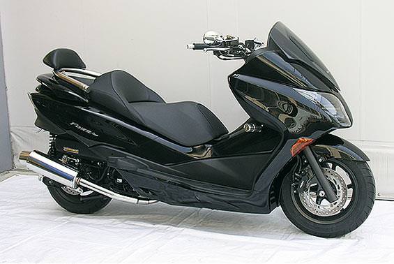 ■受注生産商品となっており、商品手配後 2週間程度入荷にお時間を頂きます。■オールステンレス製で、エキパイからサイレンサーまでバフ仕上げを施しています。ビッグスクーターにマッチするようエキパイ径45mm、サイレンサー径120mmの仕様で、装着時の全体的なバランスがとれた仕上がりとなっています。低中速を落とすことなく高回転でスムーズに回り扱いやすい設定になっています。振動防止のためサイレンサーとエキパイが2分割となる安心設計になっています。サイレンサーは、3点止めになっていますのでしっかりと固定でき、耐久性にも優れています。無加工ボルトオンにて装着できますので、必要な工具があれば簡単に取り付けできます。(取り付けに必要なボルト類は全て付属しております。)サイレンサーはストレート構造ではなくフロント部にパンチングを施した作りになっていますので、音量は静かめに抑えられており近所迷惑になる事無く安心して走行できます。ローダウンにも対応しておりますので、安心してご使用下さい。バッフル装着時 約87db(法定規制値内音量)バッフル非装着時 約90dbになります。
