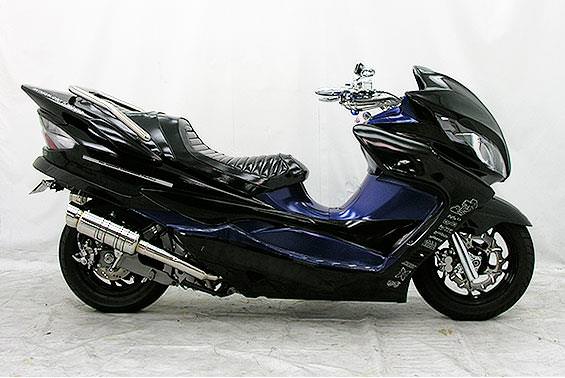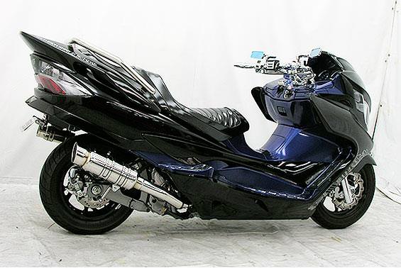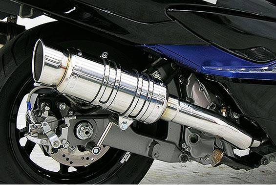 ■受注生産商品となっており、商品手配後 2週間程度入荷にお時間を頂きます。■オールステンレス製でエキパイからサイレンサーまでバフ仕上げを施しています。ビッグスクーターにマッチするよう極太のエキパイ60mm径、サイレンサー110mm径の仕様で、非常にバランスのとれた仕上がりなっています。性能面は、低中速を落とすことなく高回転でスムーズに回り扱いやすい設定になっています。サイレンサーは、ストレート構造ではなくフロント部にパンチングを施した作りになっていますので音量は、静かめに押さえられ近所迷惑になる事無く安心して走行できます。音質も耳障りな音でなくバッフル装着時は静かめの低音、バッフル非装着時は心地よい最高の重低音を実現しております。排気音量はバッフル装着時 約90db(法定規制値内音量)バッフル非装着時 約93db になります。無加工ボルトオンにて装着できますので、必要な工具があれば簡単に取り付けできます。(取り付けに必要なボルト類は全て付属しております。)振動防止のためサイレンサーとエキパイが2分割になる安心設計になっており、耐久性が抜群に高い構造を採用しています。サイレンサーの固定にはサイレンサーバンドを採用し、バフ仕上げを施したステンレス製丸棒で組んだステーを介して固定しておりますので、従来のステーの固定より車体と調和した高級感あふれるマフラーです。ローダウンにも対応しておりますので、安心してご使用下さい。