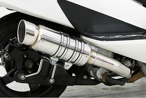 ■受注生産商品となっており、商品手配後 2週間程度入荷にお時間を頂きます。■オールステンレス製でエキパイからサイレンサーまでバフ仕上げを施しています。ビッグスクーターにマッチするよう極太のエキパイ60mm径、サイレンサー110mm径の仕様で、非常にバランスのとれた仕上がりなっています。性能面は、低中速を落とすことなく高回転でスムーズに回り扱いやすい設定になっています。サイレンサーは、ストレート構造ではなくフロント部にパンチングを施した作りになっていますので音量は、静かめに押さえられ近所迷惑になる事無く安心して走行できます。音質も耳障りな音でなくバッフル装着時は静かめの低音、バッフル非装着時は心地よい最高の重低音を実現しております。排気音量はバッフル装着時 約90db(法定規制値内音量)バッフル非装着時 約93db になります。無加工ボルトオンにて装着できますので、必要な工具があれば簡単に取り付けできます。(取り付けに必要なボルト類は全て付属しております。)振動防止のためサイレンサーとエキパイが2分割になる安心設計になっており、耐久性が抜群に高い構造を採用しています。サイレンサーの固定にはサイレンサーバンドを採用し、バフ仕上げを施したステンレス製丸棒で組んだステーを介して固定しておりますので、従来のステーの固定より車体と調和した高級感あふれるマフラーです。ローダウンにも対応しておりますので、安心してご使用下さい。