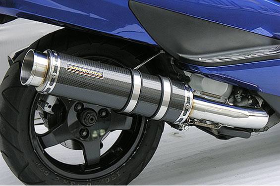 ■受注生産商品となっており、商品手配後 2週間程度入荷にお時間を頂きます。■大柄なビッグスクーターの車体にマッチするよう、極太のエキパイ60mm径、サイレンサー110mm径という仕様で、バランスのとれた仕上がりなっています。ブラックカーボンタイプは、ステンレスサイレンサーにカーボンシートを巻いた仕様で、耐久性が抜群に高い構造を採用しています。サイレンサーの固定にはサイレンサーバンドを採用し、バフ仕上げを施したステンレス製丸棒で組んだステーを介して固定しておりますので、従来のステーの固定より車体と調和した高級感あふれるマフラーです。オールステンレス製で、エキパイからサイレンサーまでバフ仕上げを施しています。低中速を落とすことなく高回転でスムーズに回り扱いやすい設定になっています。振動防止のためサイレンサーとエキパイが2分割となる安心設計になっています。サイレンサーは、2点止めになっていますのでしっかりと固定でき、耐久性にも優れています。無加工ボルトオンにて装着できますので、必要な工具があれば簡単に取り付けできます。(取り付けに必要なボルト類は全て付属しております。)サイレンサーはストレート構造ではなくフロント部にパンチングを施した作りになっていますので、音量は静かめに抑えられており近所迷惑になる事無く安心して走行できます。バッフル装着時 約89db(法定規制値内音量)バッフル非装着時 約92dbになります。ローダウンにも対応しておりますので、安心してご使用下さい。