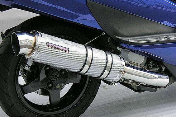 ■受注生産商品となっており、商品手配後 2週間程度入荷にお時間を頂きます。■大柄なビッグスクーターの車体にマッチするよう、極太のエキパイ60mm径、サイレンサー110mm径という仕様で、バランスのとれた仕上がりなっています。ホワイトカーボンタイプは、ステンレスサイレンサーにカーボンシートを巻いた仕様で、耐久性が抜群に高い構造を採用しています。サイレンサーの固定にはサイレンサーバンドを採用し、バフ仕上げを施したステンレス製丸棒で組んだステーを介して固定しておりますので、従来のステーの固定より車体と調和した高級感あふれるマフラーです。オールステンレス製で、エキパイからサイレンサーまでバフ仕上げを施しています。低中速を落とすことなく高回転でスムーズに回り扱いやすい設定になっています。振動防止のためサイレンサーとエキパイが2分割となる安心設計になっています。サイレンサーは、2点止めになっていますのでしっかりと固定でき、耐久性にも優れています。無加工ボルトオンにて装着できますので、必要な工具があれば簡単に取り付けできます。(取り付けに必要なボルト類は全て付属しております。)サイレンサーはストレート構造ではなくフロント部にパンチングを施した作りになっていますので、音量は静かめに抑えられており近所迷惑になる事無く安心して走行できます。バッフル装着時 約89db(法定規制値内音量)バッフル非装着時 約92dbになります。ローダウンにも対応しておりますので、安心してご使用下さい。
