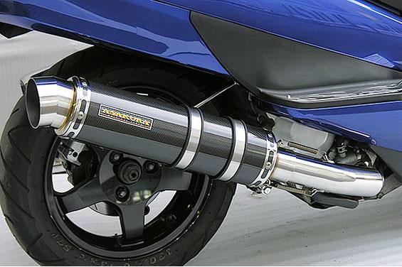 ■受注生産商品となっており、商品手配後 2週間程度入荷にお時間を頂きます。■大柄なビッグスクーターの車体にマッチするよう、極太のエキパイ60mm径、サイレンサー110mm径という仕様で、バランスのとれた仕上がりなっています。ブラックカーボンタイプは、ステンレスサイレンサーにカーボンシートを巻いた仕様で、耐久性が抜群に高い構造を採用しています。サイレンサーの固定にはサイレンサーバンドを採用し、バフ仕上げを施したステンレス製丸棒で組んだステーを介して固定しておりますので、従来のステーの固定より車体と調和した高級感あふれるマフラーです。オールステンレス製で、エキパイからサイレンサーまでバフ仕上げを施しています。低中速を落とすことなく高回転でスムーズに回り扱いやすい設定になっています。振動防止のためサイレンサーとエキパイが2分割となる安心設計になっています。サイレンサーは、2点止めになっていますのでしっかりと固定でき、耐久性にも優れています。無加工ボルトオンにて装着できますので、必要な工具があれば簡単に取り付けできます。(取り付けに必要なボルト類は全て付属しております。)サイレンサーはストレート構造ではなくフロント部にパンチングを施した作りになっていますので、音量は静かめに抑えられており近所迷惑になる事無く安心して走行できます。バッフル装着時 約89db(法定規制値内音量)バッフル非装着時 約92dbになります。ローダウンにも対応しておりますので、安心してご使用下さい。
