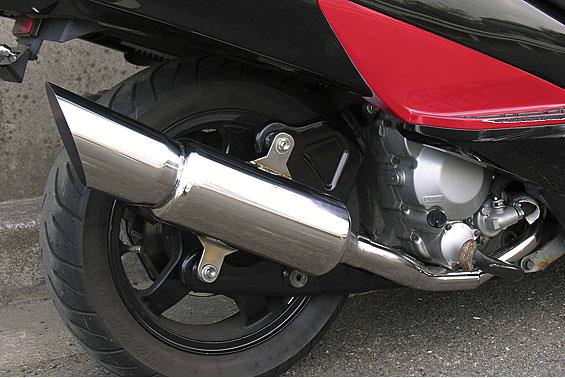 ■受注生産商品となっており、商品手配後 2週間程度入荷にお時間を頂きます。■オールステンレス製で、エキパイからサイレンサーまでバフ仕上げを施しています。ビッグスクーターにマッチするようエキパイ径45mm、サイレンサー径115mmの仕様で、装着時の全体的なバランスがとれた仕上がりとなっています。低中速を落とすことなく高回転でスムーズに回り扱いやすい設定になっています。振動防止のためサイレンサーとエキパイが2分割となる安心設計になっています。サイレンサーは、3点止めになっていますのでしっかりと固定でき、耐久性にも優れています。無加工ボルトオンにて装着できますので、必要な工具があれば簡単に取り付けできます。(取り付けに必要なボルト類は全て付属しております。)サイレンサーはストレート構造ではなくフロント部にパンチングを施した作りになっていますので、音量は静かめに抑えられており近所迷惑になる事無く安心して走行できます。バッフル装着時 約92db(法定規制値内音量)バッフル非装着時 約96dbになります。