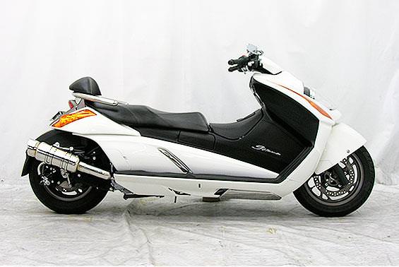 ■受注生産商品となっており、商品手配後 2週間程度入荷にお時間を頂きます。■オールステンレス製でエキパイからサイレンサーまでバフ仕上げを施しています。ビッグスクーターにマッチするよう極太のエキパイ60mm径、サイレンサー110mm径の仕様で、非常にバランスのとれた仕上がりなっています。性能面は、低中速を落とすことなく高回転でスムーズに回り扱いやすい設定になっています。サイレンサーは、ストレート構造ではなくフロント部にパンチングを施した作りになっていますので音量は、静かめに押さえられ近所迷惑になる事無く安心して走行できます。音質も耳障りな音でなくバッフル装着時は静かめの低音、バッフル非装着時は心地よい最高の重低音を実現しております。排気音量はバッフル装着時 約90db(法定規制値内音量)バッフル非装着時 約93db になります。無加工ボルトオンにて装着できますので、必要な工具があれば簡単に取り付けできます。(取り付けに必要なボルト類は全て付属しております。)振動防止のためサイレンサーとエキパイが2分割になる安心設計になっており、耐久性が抜群に高い構造を採用しています。サイレンサーの固定にはサイレンサーバンドを採用し、バフ仕上げを施したステンレス製丸棒で組んだステーを介して固定しておりますので、従来のステーの固定より車体と調和した高級感あふれるマフラーです。ローダウンにも対応しておりますので、安心してご使用下さい。