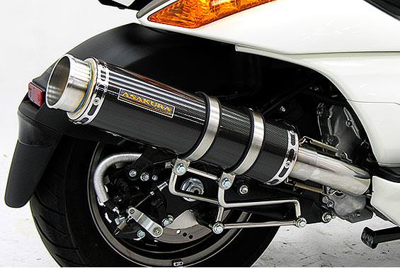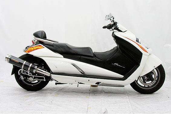 ■受注生産商品となっており、商品手配後 2週間程度入荷にお時間を頂きます。■大柄なビッグスクーターの車体にマッチするよう、極太のエキパイ60mm径、サイレンサー110mm径という仕様で、バランスのとれた仕上がりなっています。ブラックカーボンタイプは、ステンレスサイレンサーにカーボンシートを巻いた仕様で、耐久性が抜群に高い構造を採用しています。サイレンサーの固定にはサイレンサーバンドを採用し、バフ仕上げを施したステンレス製丸棒で組んだステーを介して固定しておりますので、従来のステーの固定より車体と調和した高級感あふれるマフラーです。オールステンレス製で、エキパイからサイレンサーまでバフ仕上げを施しています。低中速を落とすことなく高回転でスムーズに回り扱いやすい設定になっています。振動防止のためサイレンサーとエキパイが2分割となる安心設計になっています。サイレンサーは、2点止めになっていますのでしっかりと固定でき、耐久性にも優れています。無加工ボルトオンにて装着できますので、必要な工具があれば簡単に取り付けできます。(取り付けに必要なボルト類は全て付属しております。)サイレンサーはストレート構造ではなくフロント部にパンチングを施した作りになっていますので、音量は静かめに抑えられており近所迷惑になる事無く安心して走行できます。バッフル装着時 約89db(法定規制値内音量)バッフル非装着時 約92dbになります。ローダウンにも対応しておりますので、安心してご使用下さい。