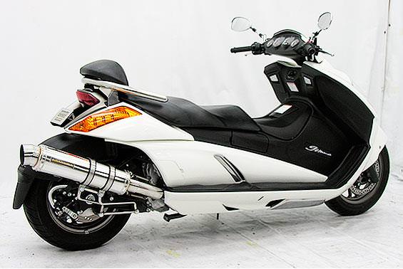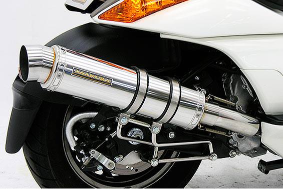 大柄なビッグスクーターの車体にマッチするよう、極太のエキパイ60mm径、サイレンサー110mm径という仕様で、バランスのとれた仕上がりなっています。