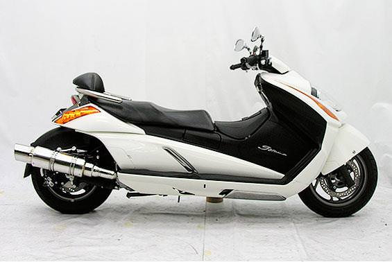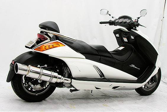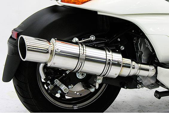■受注生産商品となっており、商品手配後 2週間程度入荷にお時間を頂きます。■オールステンレス製で、エキパイからサイレンサーまでバフ仕上げを施しています。ビッグスクーターにマッチするようエキパイ径60mm、サイレンサー径125mmの仕様で、装着時の全体的なバランスがとれた仕上がりとなっています。低中速を落とすことなく高回転でスムーズに回り扱いやすい設定になっています。振動防止のためサイレンサーとエキパイが2分割となる安心設計になっています。サイレンサーは、3点止めになっていますのでしっかりと固定でき、耐久性にも優れています。無加工ボルトオンにて装着できますので、必要な工具があれば簡単に取り付けできます。(取り付けに必要なボルト類は全て付属しております。)サイレンサーはストレート構造ではなくフロント部にパンチングを施した作りになっていますので、音量は静かめに抑えられており近所迷惑になる事無く安心して走行できます。バッフル装着時 約92db(法定規制値内音量)バッフル非装着時 約96dbになります。