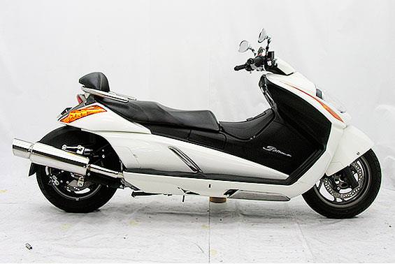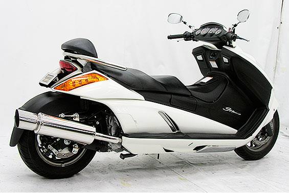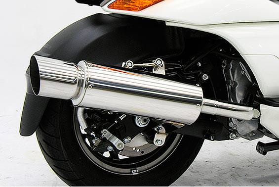■受注生産商品となっており、商品手配後 2週間程度入荷にお時間を頂きます。■オールステンレス製で、エキパイからサイレンサーまでバフ仕上げを施しています。ビッグスクーターにマッチするようエキパイ径45mm、サイレンサー径120mmの仕様で、装着時の全体的なバランスがとれた仕上がりとなっています。低中速を落とすことなく高回転でスムーズに回り扱いやすい設定になっています。振動防止のためサイレンサーとエキパイが2分割となる安心設計になっています。サイレンサーは、3点止めになっていますのでしっかりと固定でき、耐久性にも優れています。無加工ボルトオンにて装着できますので、必要な工具があれば簡単に取り付けできます。(取り付けに必要なボルト類は全て付属しております。)サイレンサーはストレート構造ではなくフロント部にパンチングを施した作りになっていますので、音量は静かめに抑えられており近所迷惑になる事無く安心して走行できます。バッフル装着時 約87db(法定規制値内音量)バッフル非装着時 約90dbになります。