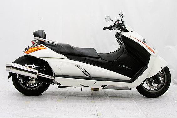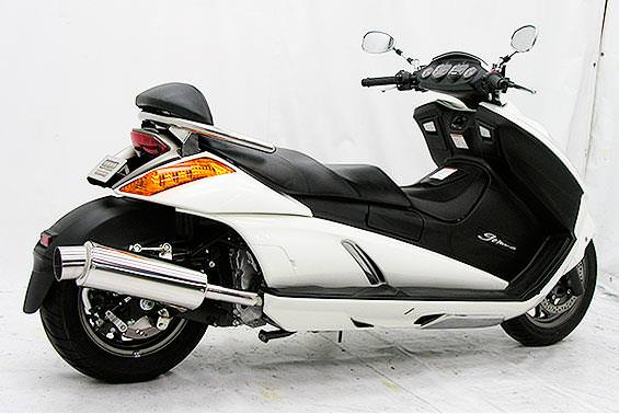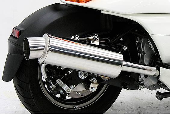 ■受注生産商品となっており、商品手配後 2週間程度入荷にお時間を頂きます。■オールステンレス製で、エキパイからサイレンサーまでバフ仕上げを施しています。ビッグスクーターにマッチするようエキパイ径45mm、サイレンサー径120mmの仕様で、装着時の全体的なバランスがとれた仕上がりとなっています。低中速を落とすことなく高回転でスムーズに回り扱いやすい設定になっています。振動防止のためサイレンサーとエキパイが2分割となる安心設計になっています。サイレンサーは、3点止めになっていますのでしっかりと固定でき、耐久性にも優れています。無加工ボルトオンにて装着できますので、必要な工具があれば簡単に取り付けできます。(取り付けに必要なボルト類は全て付属しております。)サイレンサーはストレート構造ではなくフロント部にパンチングを施した作りになっていますので、音量は静かめに抑えられており近所迷惑になる事無く安心して走行できます。バッフル装着時 約87db(法定規制値内音量)バッフル非装着時 約90dbになります。