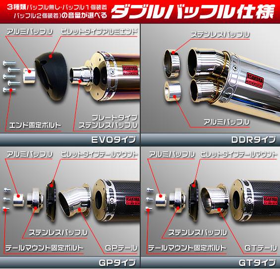 ■受注生産商品となっており、商品手配後 2週間程度入荷にお時間を頂きます。■※O2センサーが装着されていないモデルには対応しておりませんので、ご注文の際にはお間違えの無いようご注意下さい。※画像中の取付車種は参考となります。お届け商品は適合商品となります。※平成22年4月1日より施行された認証制度に適合する認証マフラーではありません。ご理解の程よろしくお願い致します。新時代から導き出された究極のイノベーションデザインで非常にインパクトあるマフラーです。メタルバージョンはステンレスをバフ磨きでピカピカに仕上げています。消音用のバッフルが2個装備されている【ダブルバッフル仕様】となっており、バッフル無し、バッフル1個装着、バッフル2個装着と3種類の排気音を選べるサウンドセレクトスタイルになっています。バッフルはステンレスタイプとアルミタイプの2種類のバッフルが装備されています。音量はバッフル2個装着時の排気音量が 約82db(法定規制値内音量)バッフル1個装着時の排気音量が 約84dbバッフル非装着時の排気音量が 約87db です。 音質も耳障りな音でなく重低音のサウンドになっていますので、ノーマルマフラーではちょっと物足りない方にオススメです。サイレンサーはストレート構造ではなく隔壁構造になっていますので、音量は静かめに抑えられており近所迷惑になる事無く安心して走行できます。低中速を落とすことなく高回転でスムーズに回り扱いやすい設定になっています。振動防止のためサイレンサーとエキパイが2分割となる安心設計になっています。サイレンサーは、2点止めになっていますのでしっかりと固定でき、耐久性にも優れています。無加工ボルトオンにて装着できますので、必要な工具があれば簡単に取り付けできます。(取り付けに必要なボルト類は全て付属しております。)サイレンサーバンドにはスリットタイプを採用してデザインにもこだわっています。サイレンサーの固定にはサイレンサーバンドを採用し、バフ仕上げを施したステンレス製丸棒で組んだステーを介して固定しておりますので、従来のステーの固定より車体と調和した高級感あふれるマフラーです。オールステンレス製で、エキパイからサイレンサーまでバフ仕上げを施しています。
