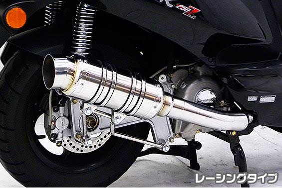 ■受注生産商品となっており、商品手配後 2週間程度入荷にお時間を頂きます。■オールステンレス製でエキパイからサイレンサーまでバフ仕上げを施しています。ビッグスクーターにマッチするよう極太のエキパイ60mm径、サイレンサー110mm径の仕様で、非常にバランスのとれた仕上がりなっています。性能面は、低中速を落とすことなく高回転でスムーズに回り扱いやすい設定になっています。サイレンサーは、ストレート構造ではなくフロント部にパンチングを施した作りになっていますので音量は、静かめに押さえられ近所迷惑になる事無く安心して走行できます。音質も耳障りな音でなくバッフル装着時は静かめの低音、バッフル非装着時は心地よい最高の重低音を実現しております。排気音量はバッフル装着時 約88db(法定規制値内音量)バッフル非装着時 約91db になります。無加工ボルトオンにて装着できますので、必要な工具があれば簡単に取り付けできます。(取り付けに必要なボルト類は全て付属しております。)振動防止のためサイレンサーとエキパイが2分割になる安心設計になっており、耐久性が抜群に高い構造を採用しています。サイレンサーの固定にはサイレンサーバンドを採用し、バフ仕上げを施したステンレス製丸棒で組んだステーを介して固定しておりますので、従来のステーの固定より車体と調和した高級感あふれるマフラーです。ローダウンにも対応しておりますので、安心してご使用下さい。
