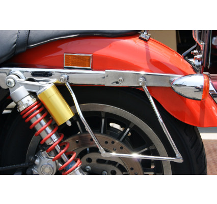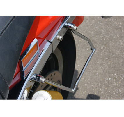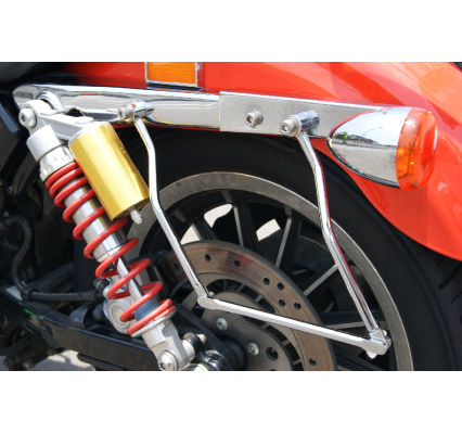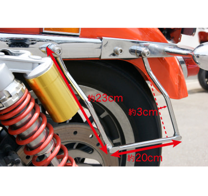 在庫状況は随時変動します。欠品時には数週間以上の納期を頂く場合がございます。サドルバッグ装着時のタイヤとの干渉を防ぎます。また、3ピース構造で二箇所の関節が可動し角度調整が自在にでき、バッグの取り付けを最適な位置でできます。COLOR: シルバー付属品: M8×70ボルト×2本、M10×70ボルト×2本寸法: 縦約23cm 横(下側)約20cm 高差約3cm ※縦横は両端からの測定値です。耐荷重2kg以下。●運転する際は毎回緩みがないか、破損がないかを確認し問題があれば使用を中止してください。●ウインカーとバッグが干渉しないようお使いください。