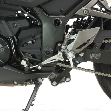 ※マフラー等を変更している場合は一部のポジションが使用できない場合があります。ノーマルステップホルダーを使用して簡単にポジション変更可能。アルミ合金削り出しブラックアルマイト。ステンレス製チェンジロッド付き。移動量:位置1)34mmバック、43mmアップ、位置2)27mmバック、23mmアップ、位置3)21mmバック、5mmアップ。