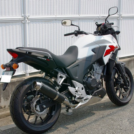 ※メーカー欠品時には受注生産となり数週間の納期を要する場合がございます。サイレンサータイプ:カーボン。ご注意) 400X専用の純正オプションのセンタースタンドをご使用の場合、この商品は装着不可となります。JMCA認定・政府認証モデル。近接排気騒音:90デシベル、加速走行騒音:78デシベル。純正触媒仕様確認書付属。オイル交換、オイルフィルター交換対応。ベンチテストにより徹底的に性能をチェック、400X の特性をより活かすべく開発しました。アクセルレスポンスの改善、低中速域のトルク・パワーUP によって回転の繋がりが更にスムーズに。センターパイプ前部にΦ42.7→Φ50 テーパーパイプを採用する事により、ストレスのない吹け上がりを実現。音質はツインの独特のパルス感を更にレーシーなイメージに味付け。ワイルド感あるサウンドを堪能頂けます。スリップオンマフラー取り付けに必要なジョイントガスケットを付属しております。