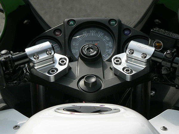 Ninja250/R専用設計で、ノーマルハンドルと交換するだけの簡単装着でハンドルポジションを約 20mm ダウン。更に別売のハンドルアップスぺーサー(品番 0418-K95-00)との併用でノーマル比 15mm もしくは 10mm ダウンのポジション変更も可能。ハンドル開き角度も標準、開き方向5度、同10度の3段階に調節可能。ベース部はノーマルハンドルASSYよりもフロントフォーク突き出し量を4mm多く取れる設計とし、更にセッティングの幅を広げます。ベース部:アルミ総削り出しアルマイト処理、ハンドルバー:ジュラルミンブラックアルマイト処理、更に専用ジュラコン製バーエンドも付属し、簡易プロテクターの役割も果たすハイクオリティ。