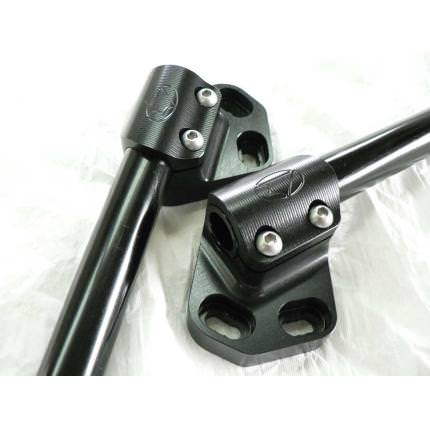 Ninja250/R専用設計で、ノーマルハンドルと交換するだけの簡単装着でハンドルポジションを約 20mm ダウン。更に別売のハンドルアップスぺーサー(品番 0418-K95-00)との併用でノーマル比 15mm もしくは 10mm ダウンのポジション変更も可能。ハンドル開き角度も標準、開き方向5度、同10度の3段階に調節可能。ベース部はノーマルハンドルASSYよりもフロントフォーク突き出し量を4mm多く取れる設計とし、更にセッティングの幅を広げます。ベース部:アルミ総削り出しアルマイト処理、ハンドルバー:ジュラルミンブラックアルマイト処理、更に専用ジュラコン製バーエンドも付属し、簡易プロテクターの役割も果たすハイクオリティ。