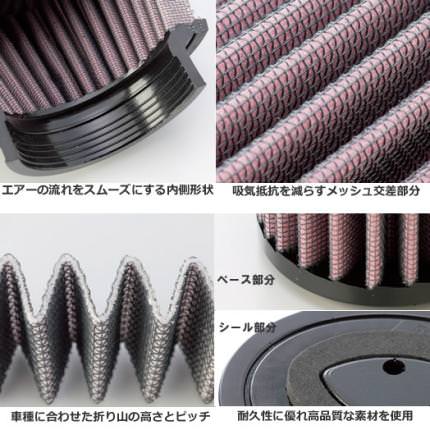 ※画像はイメージとなります。お届け商品は適合品となりますので画像と異なる場合がございます。エンジンパワーの向上に直結する吸気効率。ギリシャ製のDNAフィルターは、まるでファンネルのように吸気効率を高めるハイパフォーマンスフィルターです。より高い吸入効率、高品質、長寿命を基本コンセプトに自社開発されるフィルターは、エアフローやメッシュの交差部分、折り山の高さとピッチ、経年変化を考慮した素材の選択、さらにはフィルターオイルにも独自の技術を投入するなど、これまでのフィルターにはなかった数多くの工夫が盛り込まれています。