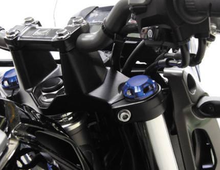 ※2個1セットとなります。ノーマルのフォークボルトに装着することで、車両のカスタムイメージを高めるドレスアップパーツです。この製品はキャップの形状に空洞を設けることで、精巧に削り出されたアルミ材のソリッドイメージを高めながら、ステアリング周りをスタイリッシュにまとめることが出来ます。又、表面にアルマイトを施すことでドレスアップ効果を高めています。カラー:ブルー装着はノーマルフォークボルトに被せるだけなので、手軽に車両のドレスアップをお楽しみ頂けます。