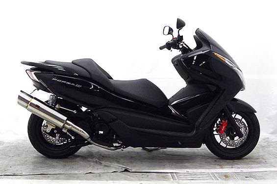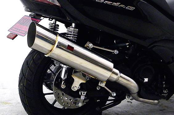 ■受注生産商品となっており、商品手配後 2週間程度入荷にお時間を頂きます。■オールステンレス製で、エキパイからサイレンサーまでバフ仕上げを施しています。ビッグスクーターにマッチするようエキパイ径60mm、サイレンサー径125mmの仕様で、装着時の全体的なバランスがとれた仕上がりとなっています。低中速を落とすことなく高回転でスムーズに回り扱いやすい設定になっています。振動防止のためサイレンサーとエキパイが2分割となる安心設計になっています。サイレンサーは、3点止めになっていますのでしっかりと固定でき、耐久性にも優れています。無加工ボルトオンにて装着できますので、必要な工具があれば簡単に取り付けできます。(取り付けに必要なボルト類は全て付属しております。)サイレンサーはストレート構造ではなくフロント部にパンチングを施した作りになっていますので、音量は静かめに抑えられており近所迷惑になる事無く安心して走行できます。バッフル装着時 約92db(法定規制値内音量)、バッフル非装着時 約96dbになります。ローダウンにも対応しておりますので、安心してご使用下さい。